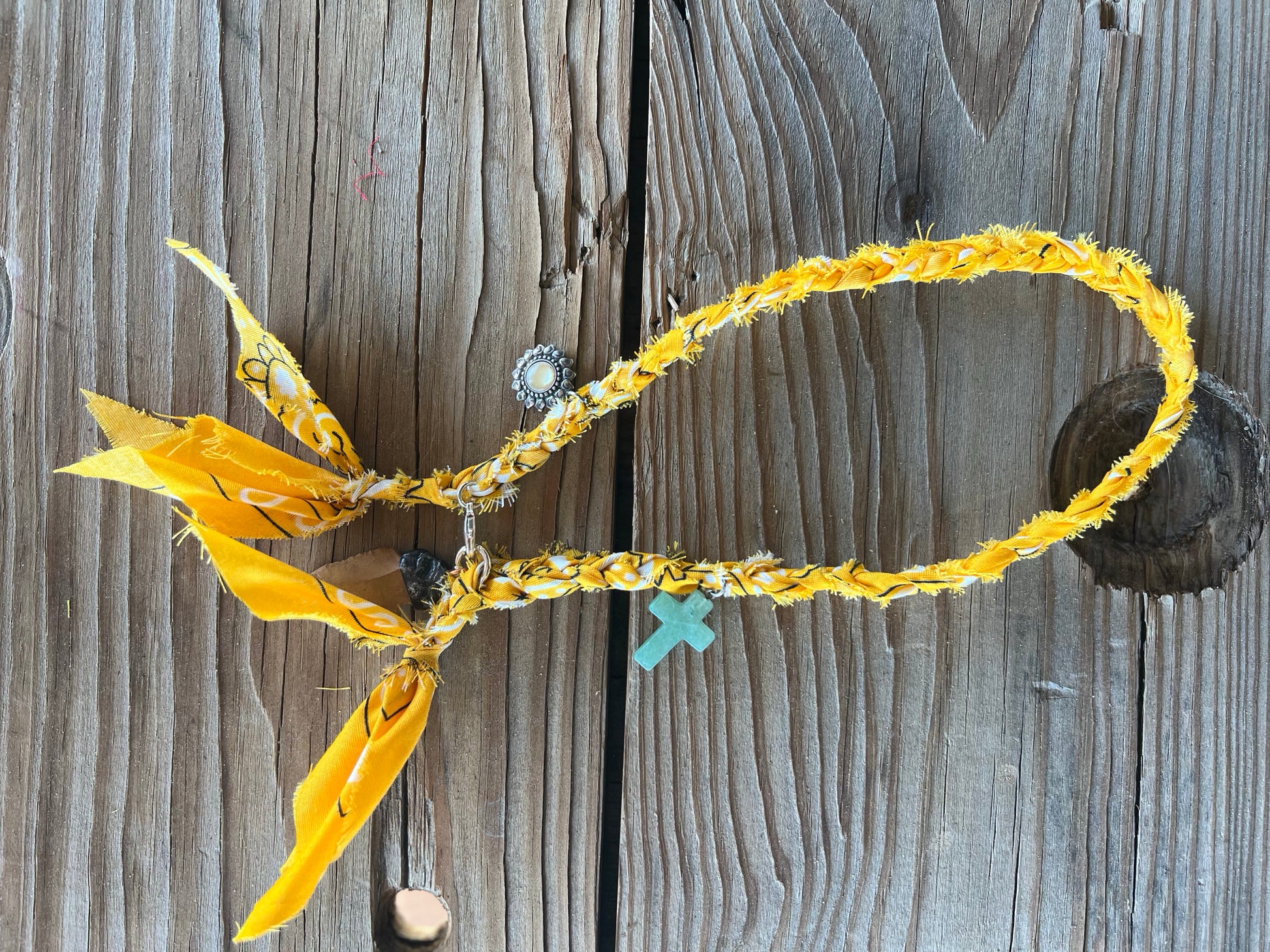 Rugged, colorful, and wild at heart — the Badlands Braids are handwoven from salvaged bandanas and desert-worn fabrics, each one finished with charms, trinkets, and vintage finds that tell their own story. Can be worn as a necklace, bracelet or boot bling.