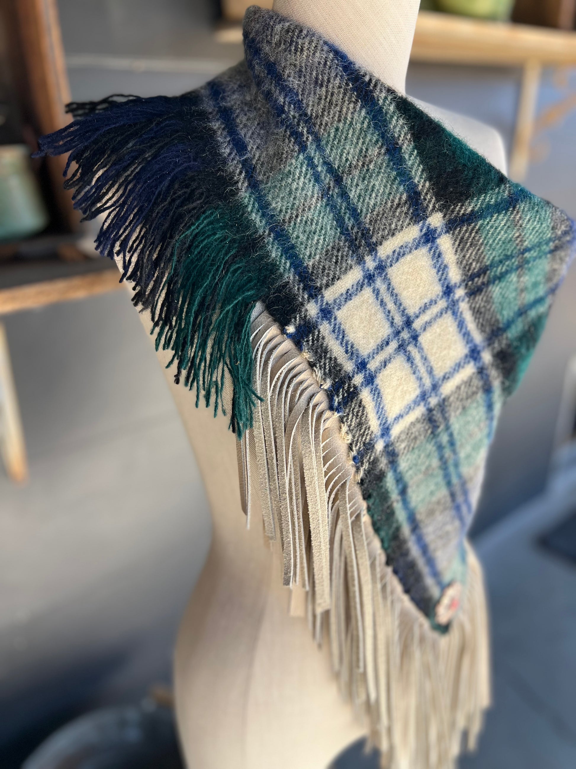 Woven from a vintage Made in England wool blanket, this shawl was made for the wanderer — part highland heritage, part desert outlaw. With soft fringe and a hand-stitched finish, it carries both polish and grit.