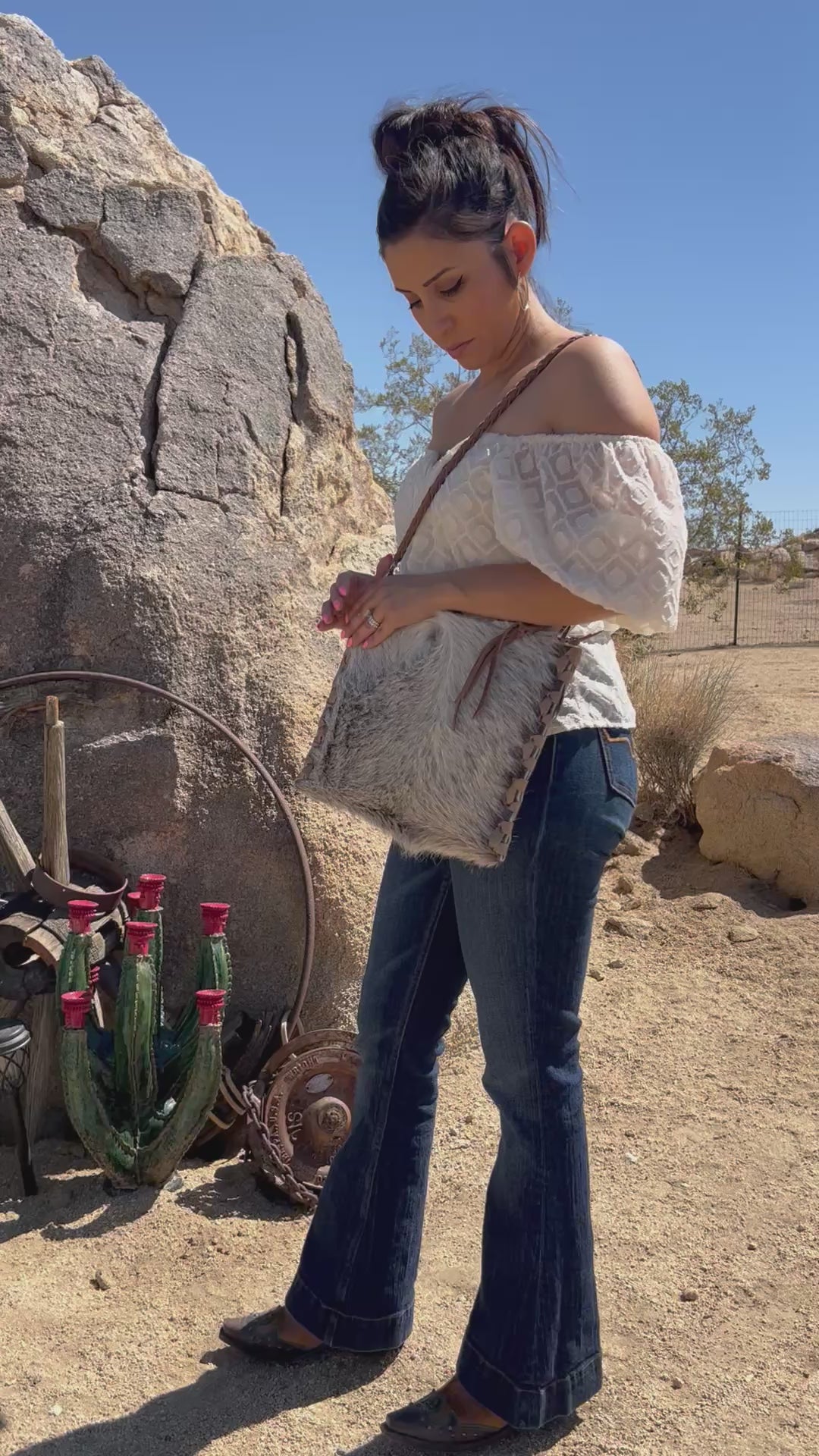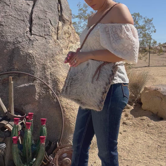 Crafted for the cowgirl with a love for natural beauty, the Dusty Silver Cowhide Shoulder Bag blends rugged charm with refined style. Made from genuine hair-on hide in a soft silver-gray swirl pattern, each piece is one-of-a-kind. Hand-braided leather edging and detachable braided strap add texture and artisanal detail, while silver hardware offers durability.